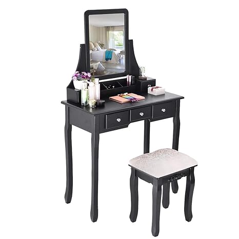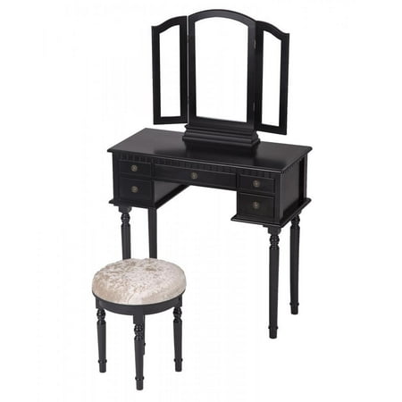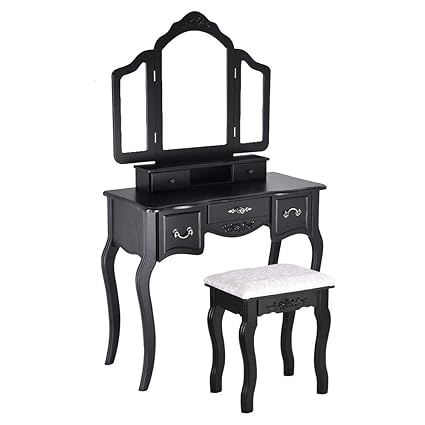 Black Makeup Vanity Table Set Tri Folding Mirror Makeup