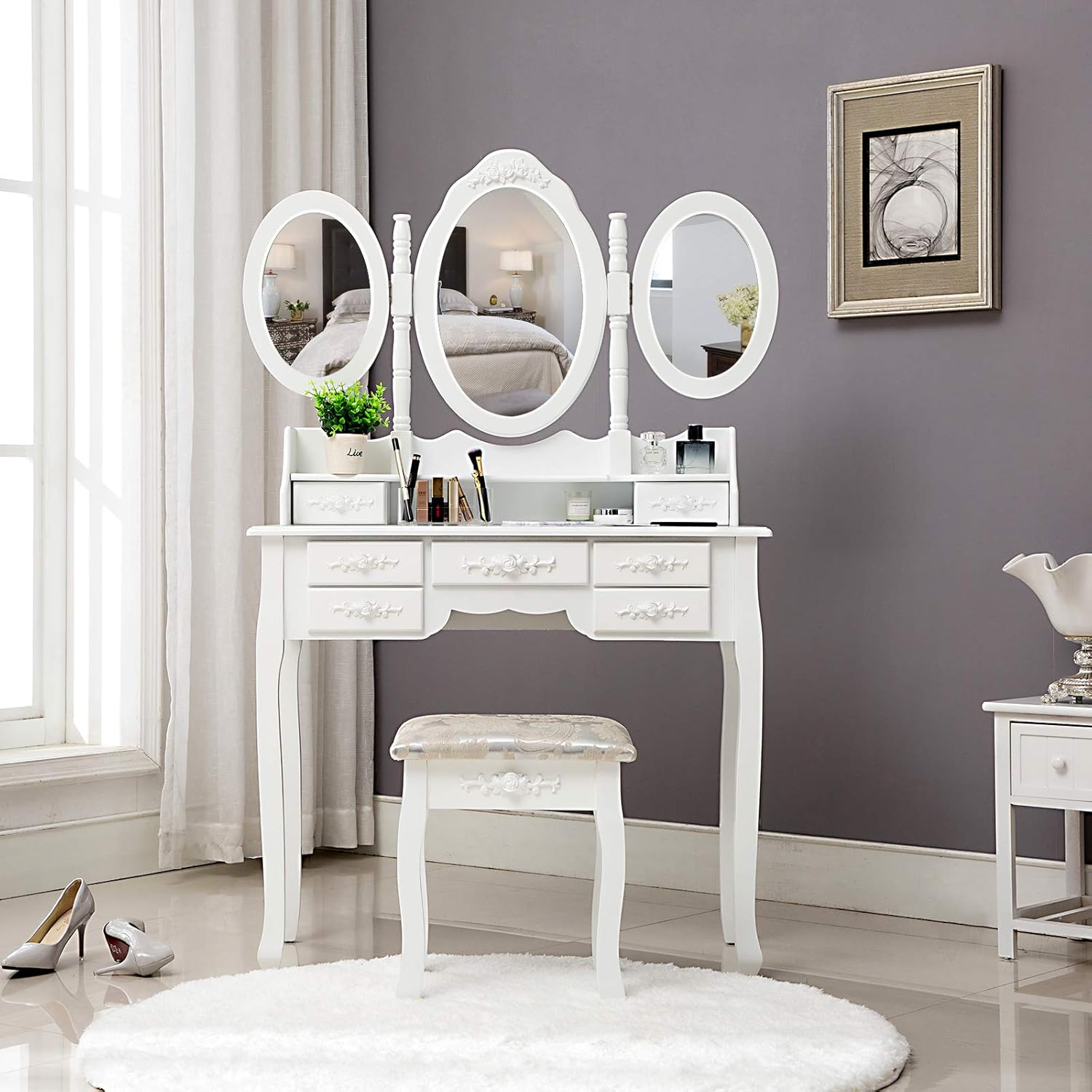 Honbay Trifold Mirrors Makeup Vanity Table Set Cushioned Stool And Surprise Gift Makeup Organizer With 7 Drawers Dressing Table White
